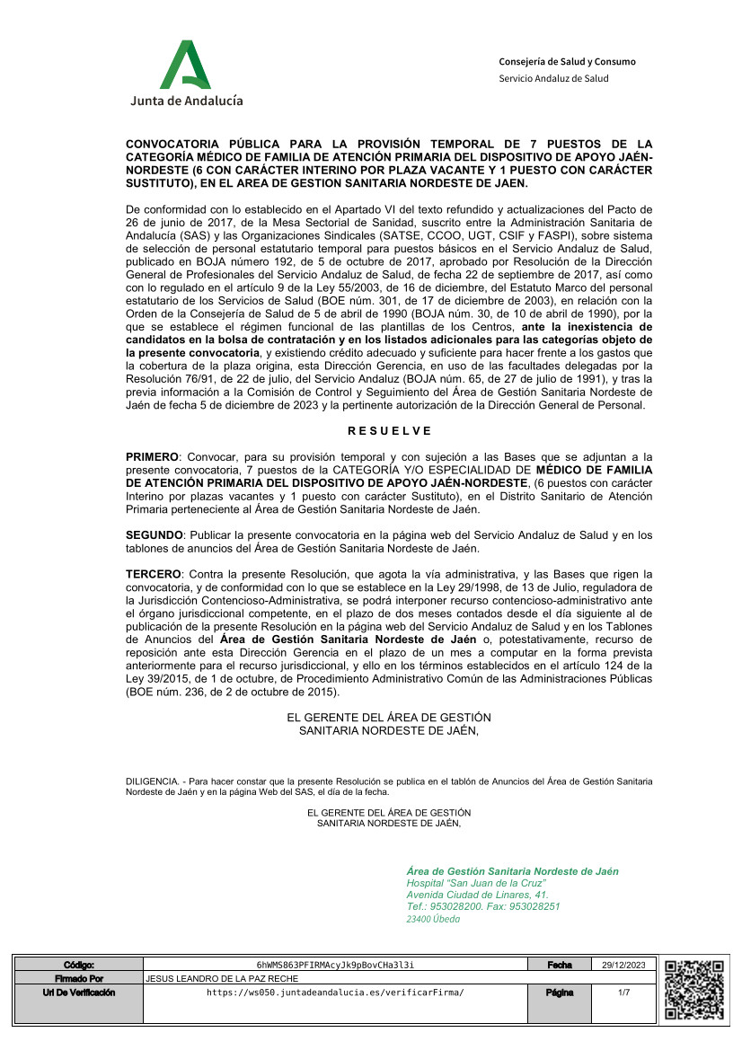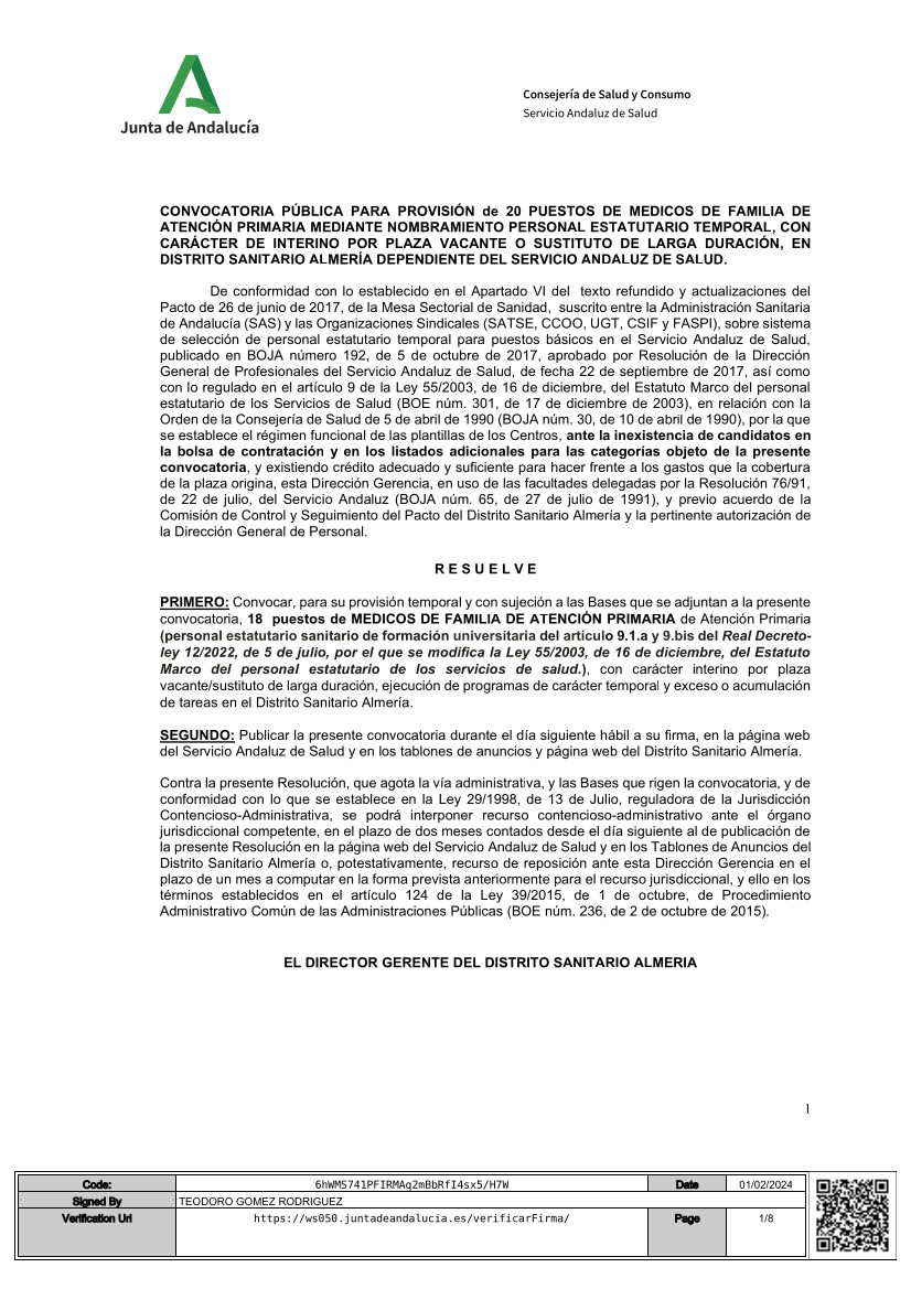 Convocatoria Pública Médicos de Familia - Distrito Sanitario de Almería